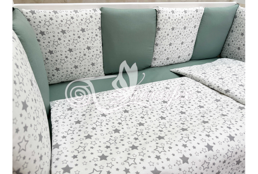 Бортик составной: 12 подушек 31х34 см на замочках упакованы в сумку-переноску.