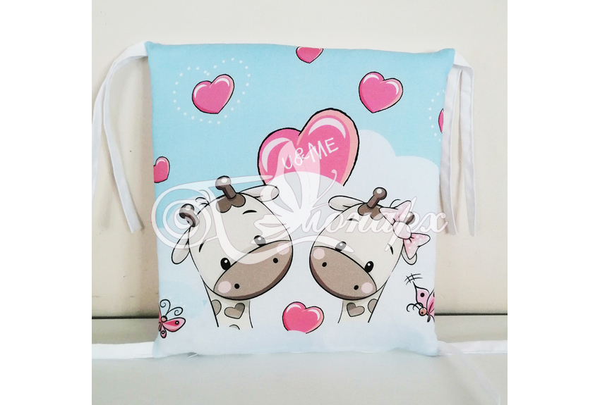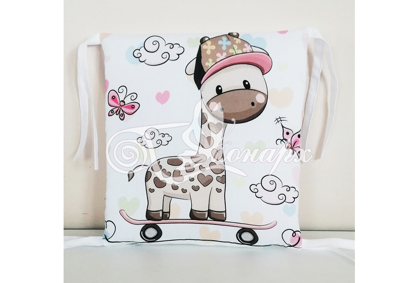 В наборе 4 плоских подушки на замочках для удобства стирки и с завязками для фиксации к кроватке.